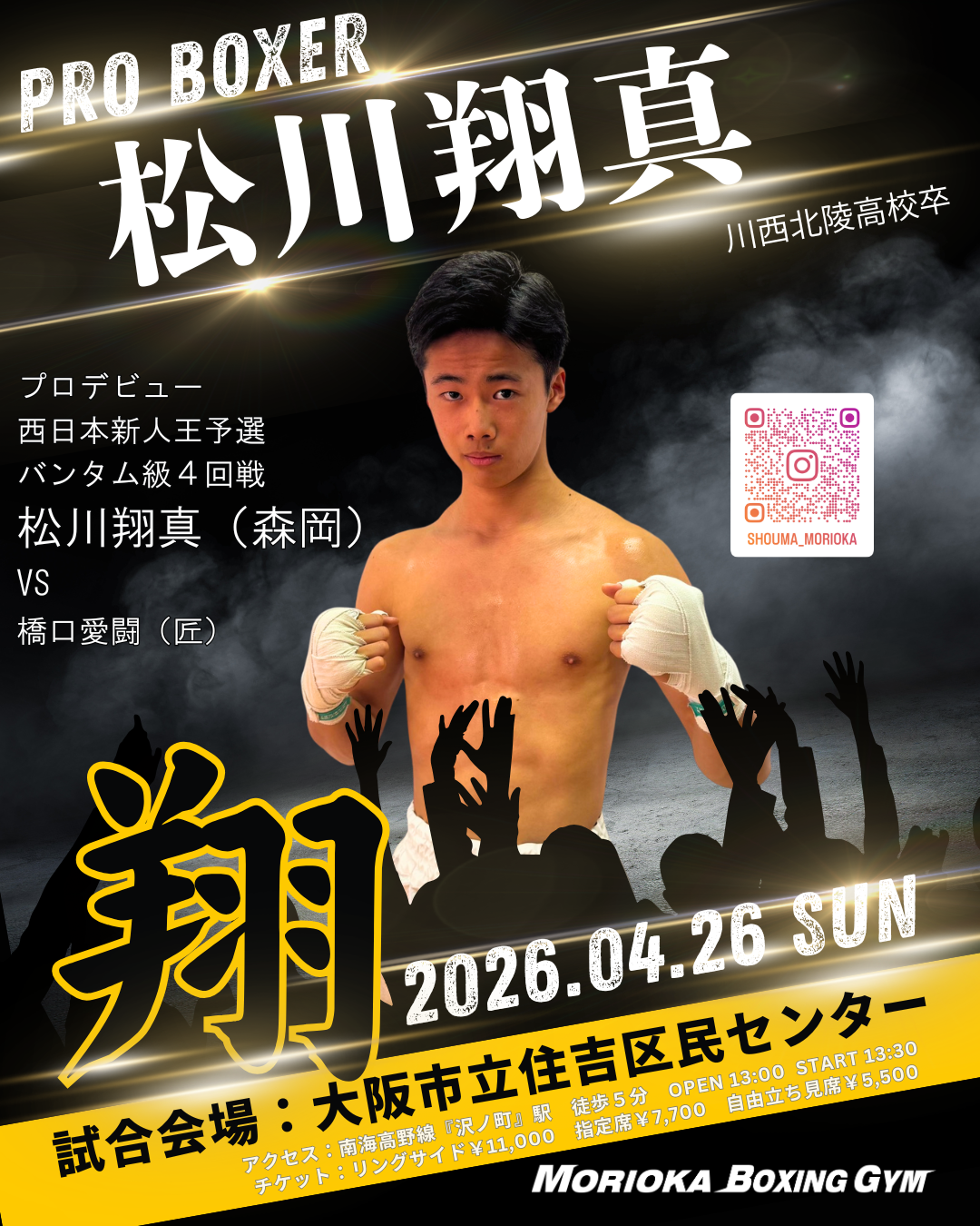 ■2026年4月26日(日) 13時30分開始 入場料 リングサイド11,000円 指定席7,700円 立ち見自由席5,500円